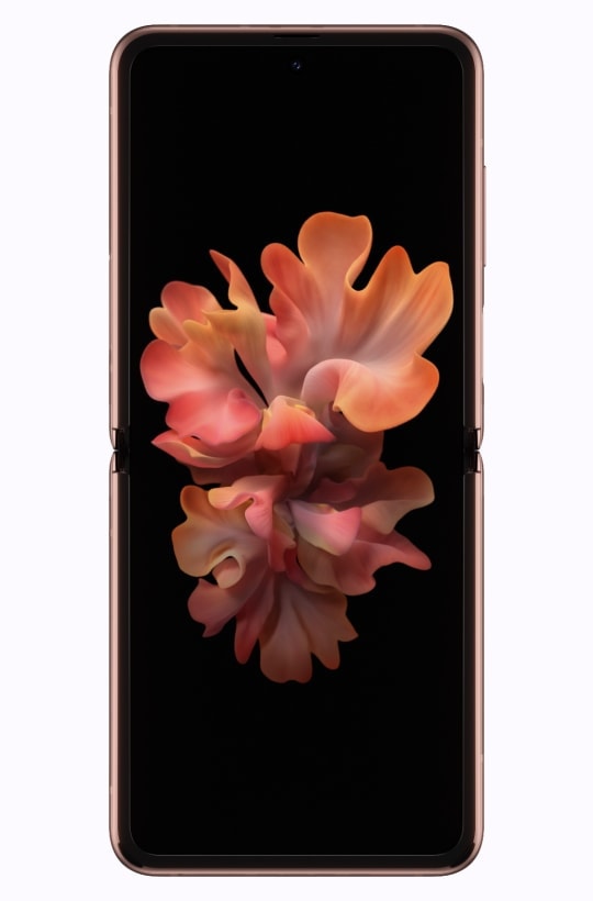 Galaxy Z Flip in Mirror Golden, seen folded from the front. Information technology spins to show the sides and the rear of the telephone and and so shifts upwards to show the sides of the phone and the Hideaway Hinge. Information technology continues spinning until the edge of the phone with the USB-C port, and and then folds completely open, displaying a graphic floral wallpaper on the Infinity Flex Display. It keeps spinning to testify the sides and rear of the phone as information technology'due south unfolded, ending with the phone, unfolded, facing forward with the Infinity Flex Display