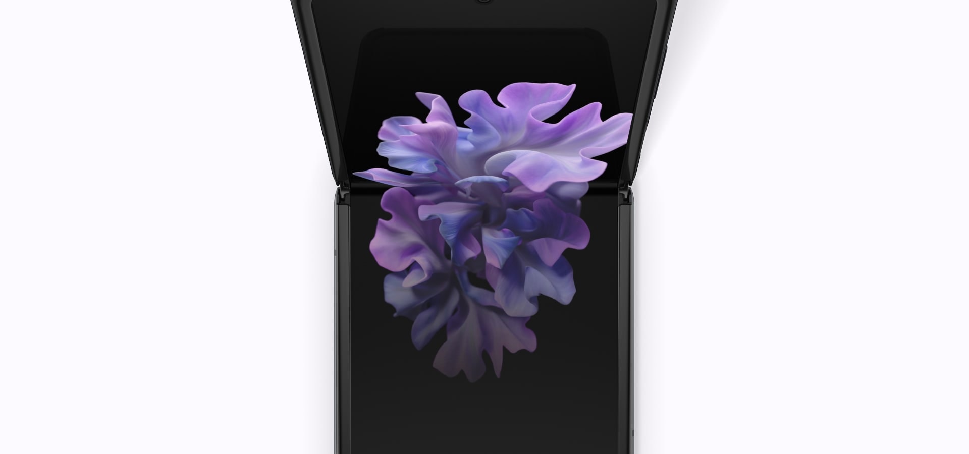 Galaxy Z Flip in Mirror Black, seen folded from the front. It spins to evidence the sides and the rear of the phone and then shifts upwards to evidence the sides of the telephone and the Hideaway Hinge. It continues spinning until the edge of the phone with the USB-C port, and and so folds completely open up, displaying a graphic floral wallpaper on the Infinity Flex Display. It keeps spinning to show the sides and rear of the phone every bit it'southward unfolded, ending with the phone, unfolded, facing forward with the Infinity Flex Display